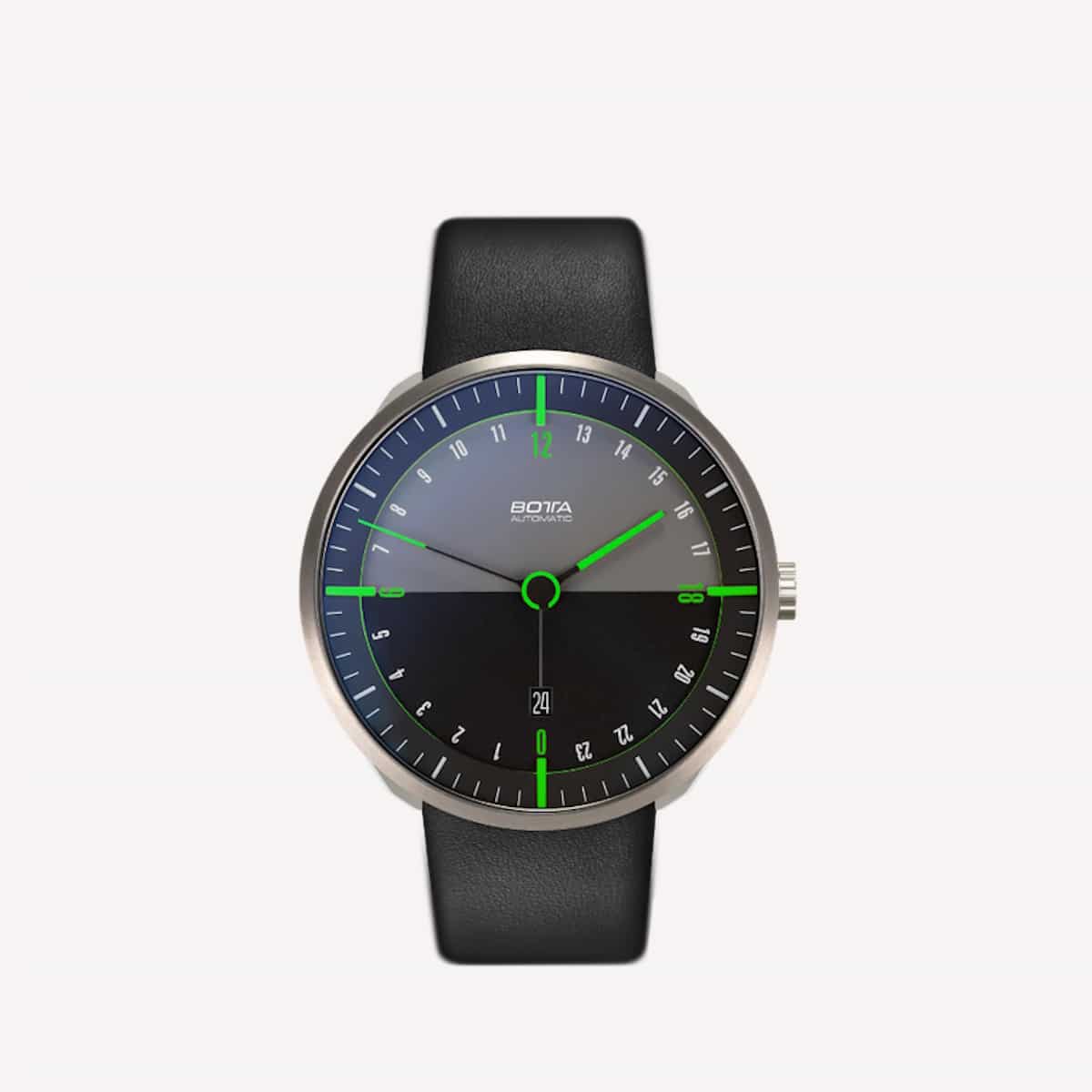 German brand Botta makes a very quirky-looking 24-hour watch. In fact, the brand wholeheartedly dedicates itself to creating these timepieces. The Tres 24 design is remarkably modern. Its central hour hand represents the position of the sun each day. The wearer can also track time accurately down to the minute. The Tres 24 is the brand’s first multi-hand automatic. Like the earth, the dial features two shades for daytime and nighttime hours: grey for day and black for night.