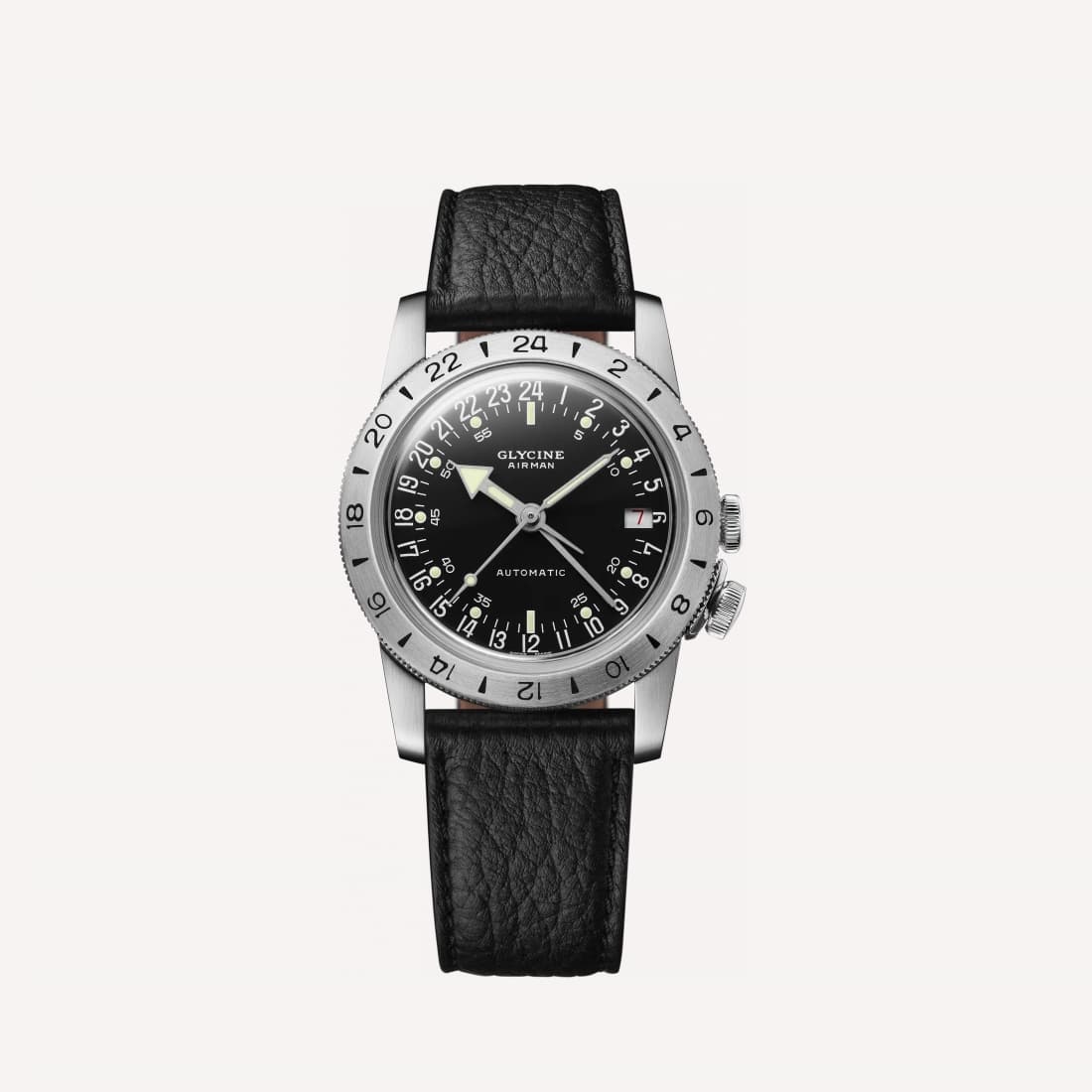 The Glycine Airman set the benchmark for many of the brand’s aviation watches. Some models from the series even feature three time zones. Something like this Airman Contemporary Men watch brings modern functionality to the wrist. This unisex watch measures 36mm on the wrist and features a steel case and a black dial.