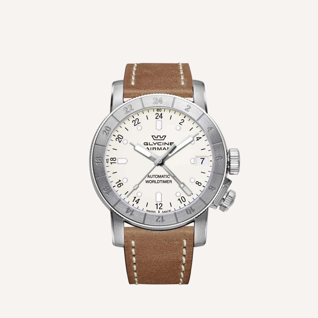 Another Glycine makes it to the list, this time a white variant. This 24-hour format watch affords a clean and crisp aesthetic with military-like looks. The brown leather strap with white contrast stitching looks traditional and classic. It secures with a comfortable stainless steel buckle bearing an Airman-engraved logo. An exhibition case back reveals the GL293 Swiss automatic movement. The engine provides a power reserve of 42 hours, a date function, and a GMT hand.