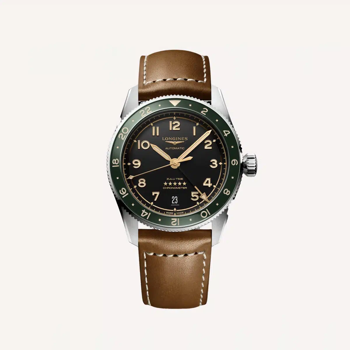 The Longines Spirit Zulu Time features a two-tone 24-hour bezel to differentiate nighttime and daylight hours. Reading off the main hands will give you your local time, while the red arrow-tipped GMT hand keeps you on track with home time. I particularly love the beige-coloured faux patina luminous material on the hands and Arabic hour markers. These features incorporate more of the vintage-inspired pilot watch aesthetics that the Spirit collection is famous for.