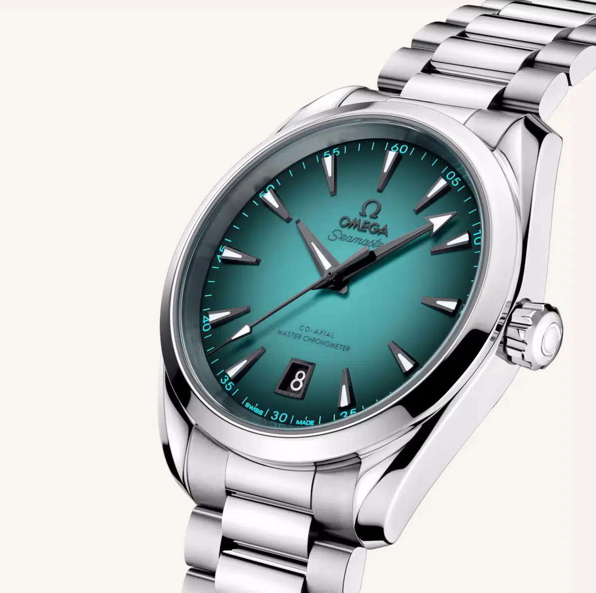 One of OMEGA’s latest Aqua Terra releases is the 150M water-resistant turquoise fume GADA watch. The model features a gradient effect dial with bright turquoise tones at the centre, melding into blackened edges. This compact 38mm model features a steel-on-steel design with 150m water resistance, a domed sapphire glass front, and an exhibition caseback.