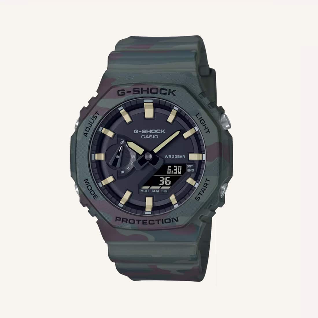 The CasiOak GAE2100WE-3A stands out from the collection due to its striking woodland-like Camo design. This is partly what lends to its bold presence. The other influential factor is its dimensions, which are large but a little deceptive. Its square adjacent case helps balance these proportions, enabling the GAE2100WE-3A to sit better on the wrist. The watch has an octagonal bezel, echoing the Royal Oak’s demeanor, and Casio fortifies the case with Carbon Core technology. Integrating carbon fiber with resin maintains the G-Shock’s reputation for toughness.